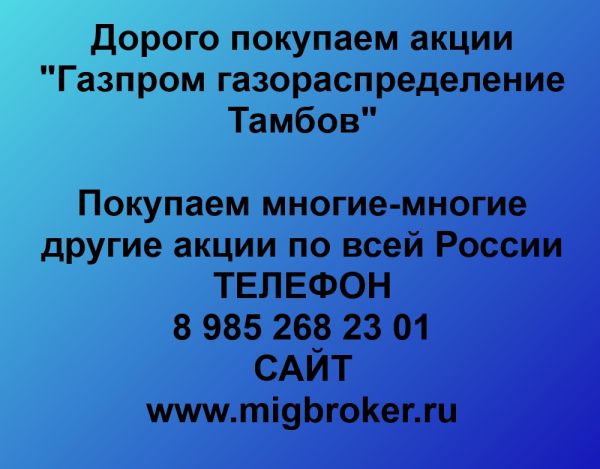 Дорого выкупим акции «Газпром газораспределение Тамбов». Оплата сразу! Выкуп акций «Газпром газораспределение Тамбов» по рыночным ценам. Регистрация сделки по продаже акций «Газпром газораспределение Тамбов» - 20 минут. Если Вы хотите продать акции «Газпром газораспределение Тамбов» - звоните!